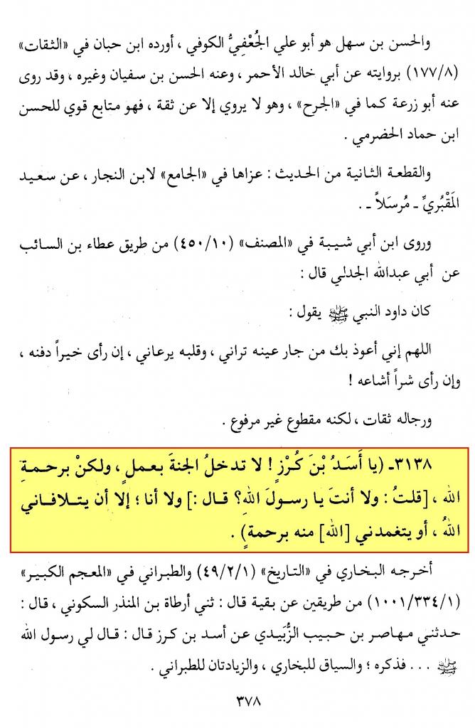يااسد بن كرز لاتدخل الجنة بعمل ولكن برحمة الله ( قلت ولا انت يارسول الله ؟ قال : ولا انا الا ان يتلافاني الله برحمته او يتغمدني الله منه برحمة)