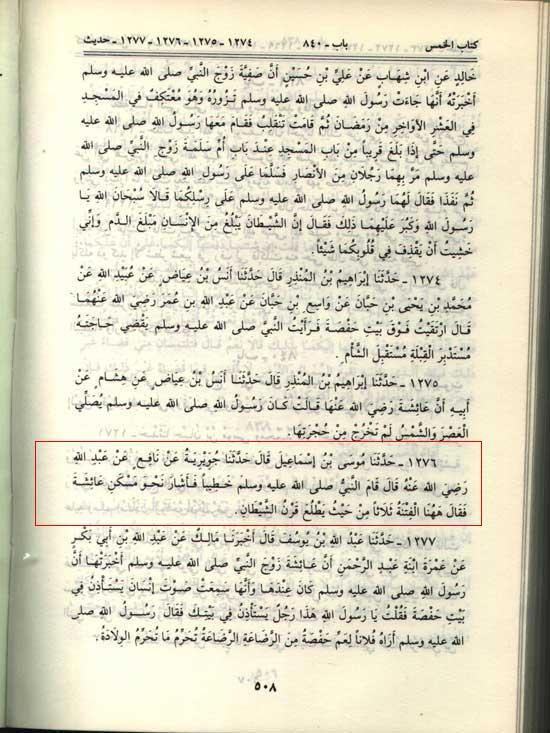 3141 ـ حَدَّثَنَا مُوسَى بْنُ إِسْمَاعِيلَ، حَدَّثَنَا جُوَيْرِيَةُ، عَنْ نَافِعٍ، عَنْ عَبْدِ اللَّهِ ـ رضى الله عنه ـ قَالَ قَامَ النَّبِيُّ صلى الله عليه وسلم خَطِيبًا فَأَشَارَ نَحْوَ مَسْكَنِ عَائِشَةَ فَقَالَ " هُنَا الْفِتْنَةُ ـ ثَلاَثًا ـ مِنْ حَيْثُ يَطْلُعُ قَرْنُ الشَّيْطَانِ ". http://www.al-eman.com/hadeeth/viewchp.asp?BID=13&CID=117#s4