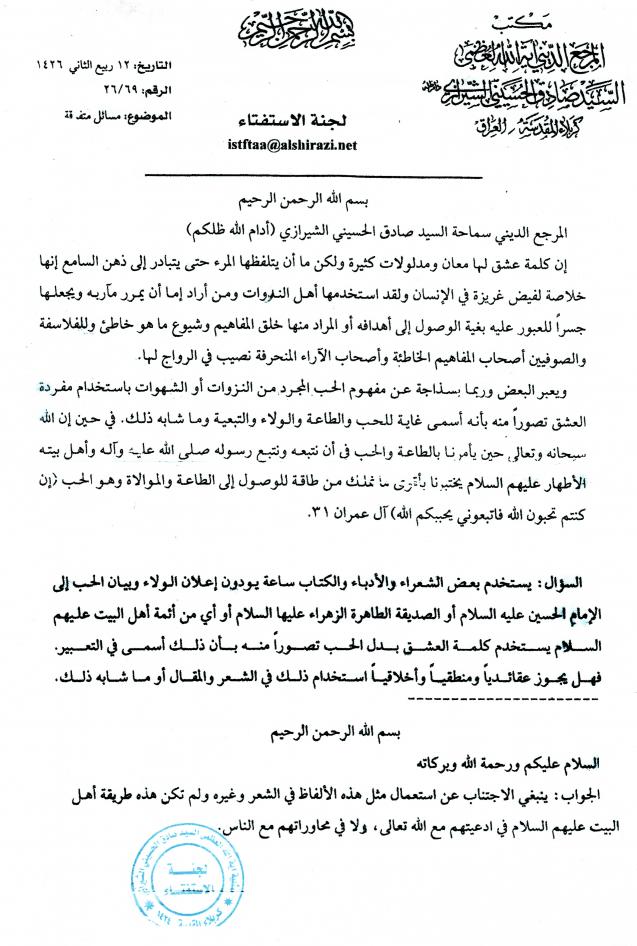 الموضوع المطروح او الاستفتاء هو ملزم لي ككاتب للشعر وما طرحه المرجع الشيرازي حفظه الله وامد في عمره على عيني ورأسي من فوق وإن كنت امتلك نظرتي الخاصة في هذا الموضوع لكن الشرع والعقل يلزمني بان اتحرى عن القضية اكثر ولا أأتي واقول كارها (والله هي ملزمة لمقلديه وووو) كلا , انا من مقلدي السيد السيستاني حفظه الله وسوف ارجع اليه في هذه المسألة