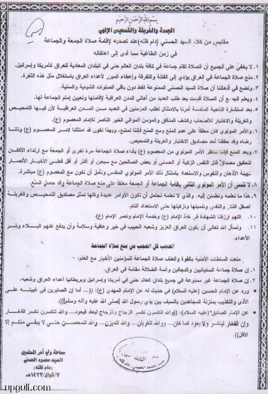 5- بعـد استشارة الناحية المقدسة أُمرنا بامتثال طلب المؤمنين في العـديد من المدن العراقية لان فيها التمحيص والغربلة والاختبار للأصحاب وكشف المنافق من المؤمن الموالي الخيّر الناصر للإمام المعصوم (عليه السلام ) .