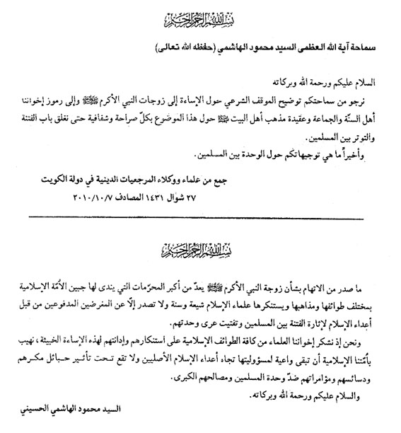 بسم الله الرحمن الرحيم سماحة آية الله العظمى السيد محمود الهاشمي (حفظه الله تعالى) السلام عليكم ورحمة الله تعالى وبركاته نرجو من سماحتكم توضيح الموقف الشرعي حول الاسائة الى زوجات النبي الاكرم صلى الله عليه وآله وسلم وإلى رموز إخواننا أهل السنة والجماعة وعقيدة مذهب أهل البيت عليهم السلام حول الموضوع بكل صراحة وشفافية حتى نغلق باب الفتنة والتوتر بين المسلمين. وأخيرا ما هي توجيهاتكم حول الوحدة بين المسلمين. جمع من علماء ووكلاء المرجعيات الدينية في دولة الكويت 27 شوال 1431 المصادف 7 / 10 / 2010 بسم الله الرحمن الرحيم ما صدر من الاتهام بشأن زوجة النبي الأكرم صلى الله عليه وآله وسلم يعد من أكبر المحرمات التي يندى لها جبين الامة الاسلامية بمختلف طوائفها ومذاهبها ويستنكرها علماء الإسلام شيعة وسنة ولا تصدر إلا عن المغرضين المدفوعين من قبل أعداء الاسلام لإثارة الفتنة بين المسلمين وتفتيت عرى وحدتهم. ونحن إذ نشكر إخواننا العلماء من كافة الطوائف الاسلامية على استنكارهم وإدانتهم لهذه الاسائة الخبيثة، نهيب بأمتنا الاسلامية أن تبقى واعية لمسؤوليتها تجاه أعداء الإسلام الأصليين ولا تقع تحت تأثير حبائل مكرهم ودسائسهم ومؤامراتهم ضد وحدة المسلمين ومصالحهم الكبرى. والسلام عليكم ورحمة الله تعالى وبركاته. السيد محمود الهاشمي الحسيني |