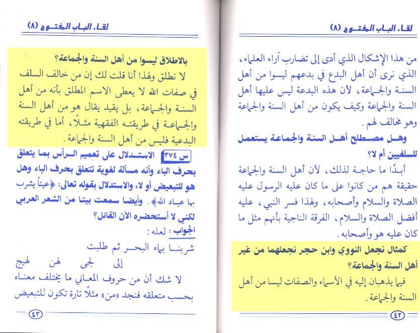 هو يقول انه فى طريقته الفقيه من اهل السنه والجماعه وليس طريقته البدعيه يعنى ان الشيخ يعتبر نفسه من اهل السنه والجماعه وليس كما تقول لم ينجو منه حتى مشايخ السنه وفعلا الامام النووى كان له بعض الانكار لصفات الله
